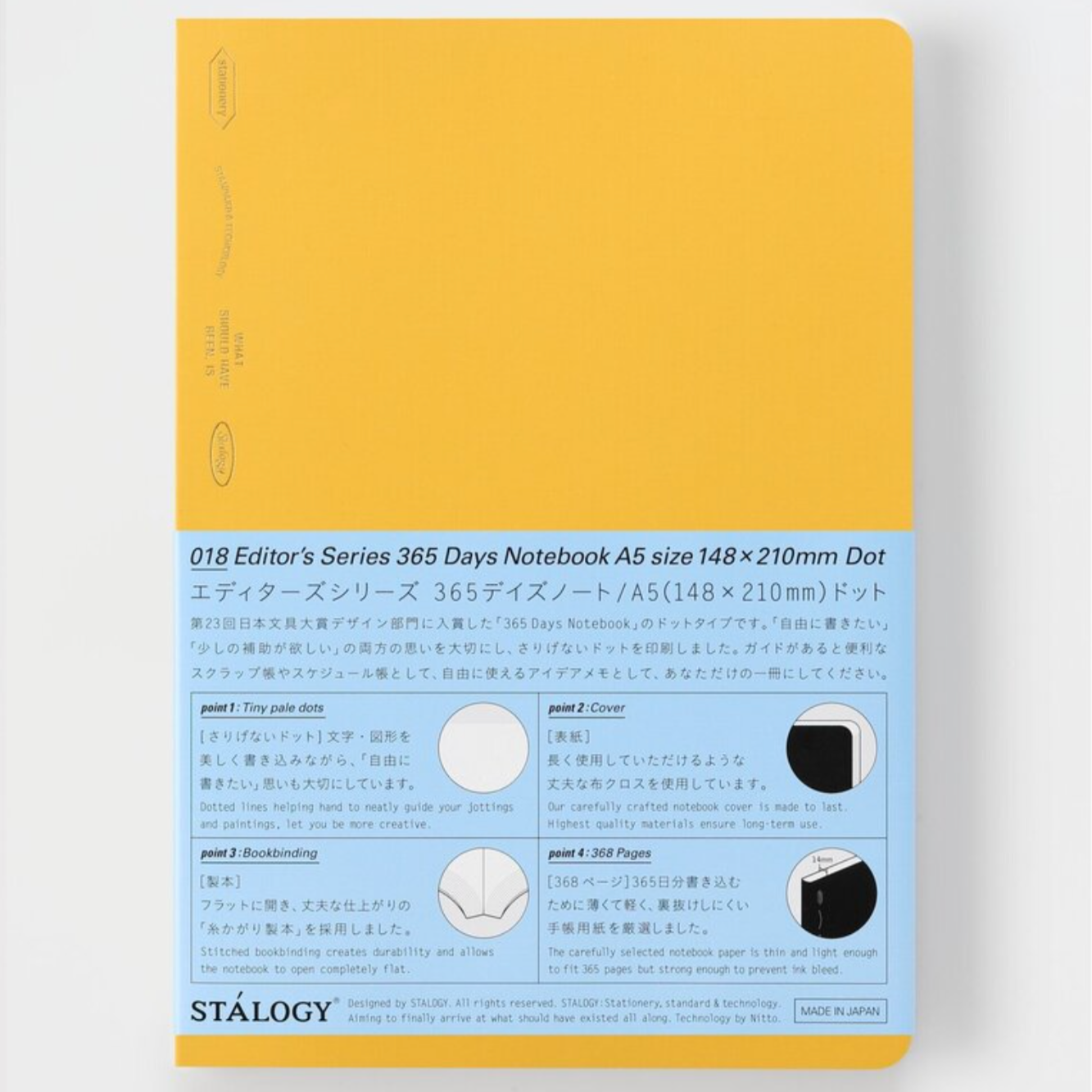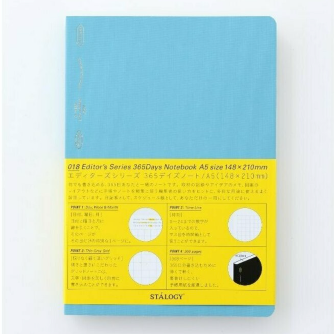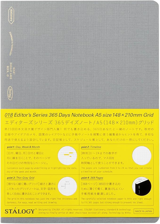 The Stalogy 365 Notebook is a minimalist Japanese planner-notebook hybrid, designed for everyday writing, journaling, or scheduling. Featuring 368 ultra-thin, bleed-resistant pages, it provides a full year’s worth of space without bulk. Each page includes subtle markers for date, time, and grids, making it easy to use as a diary, planner, or notebook. Available in A6 (pocket size) and A5 (medium size), this award-winning notebook lays flat for comfortable writing and features a sleek, flexible cover for durability and portability.