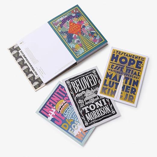 The boxed set contains fifty postcards offering two each of twenty-five cover interpretations of literary classics featured in Ex Libris. The other side includes a thoughtful quote from Kakutani’s essay about the book with plenty of room for writing a message.