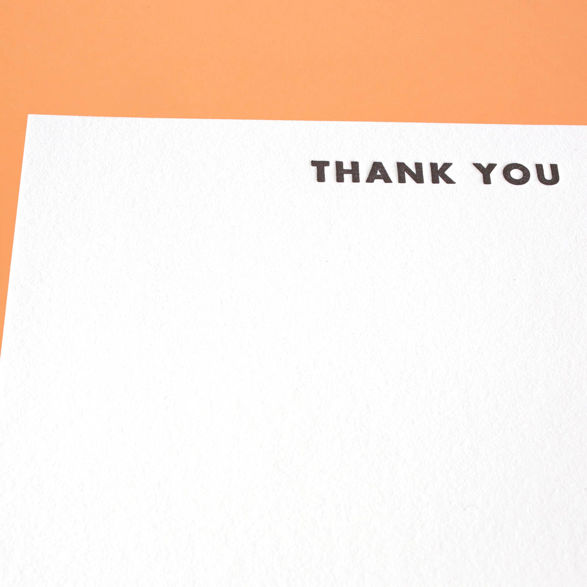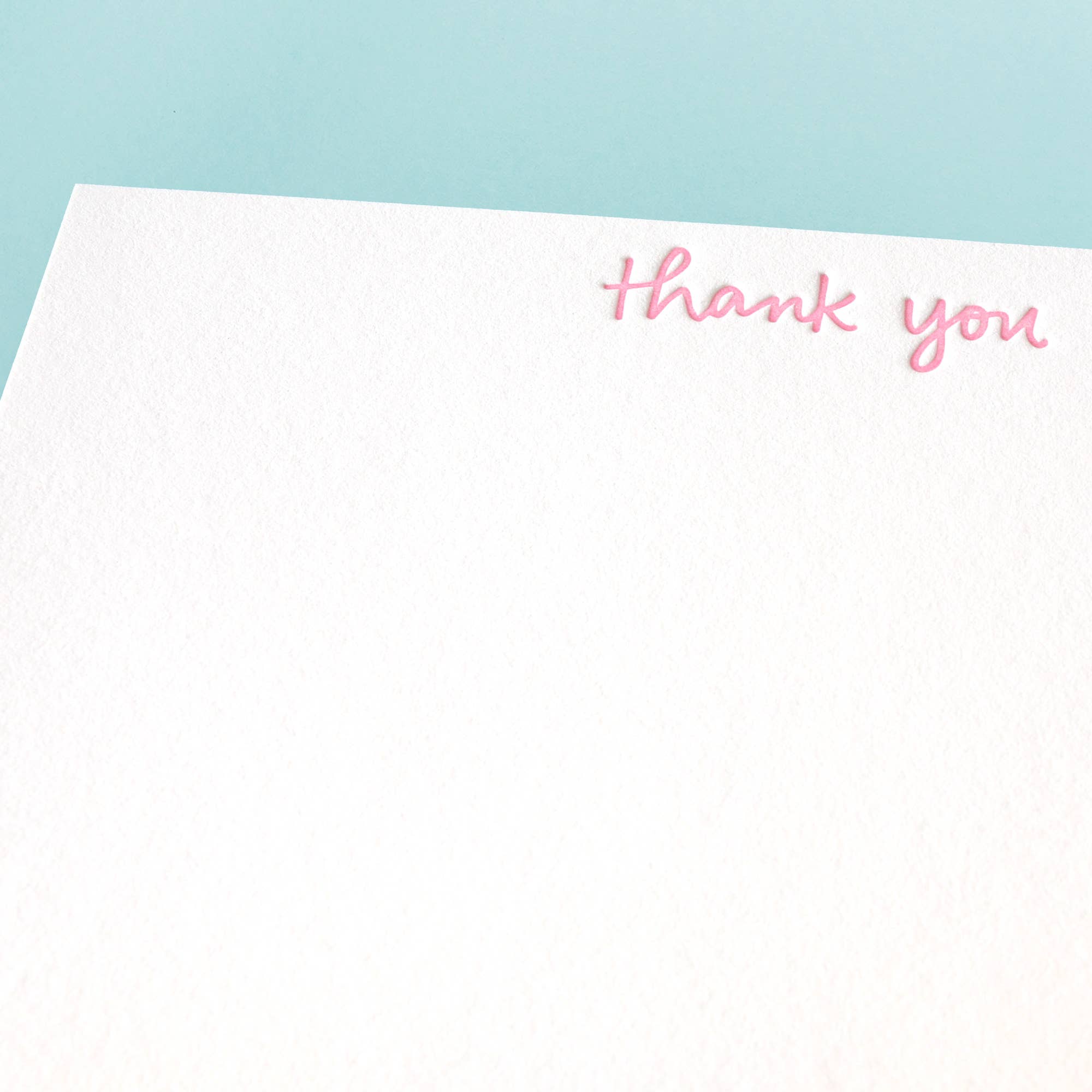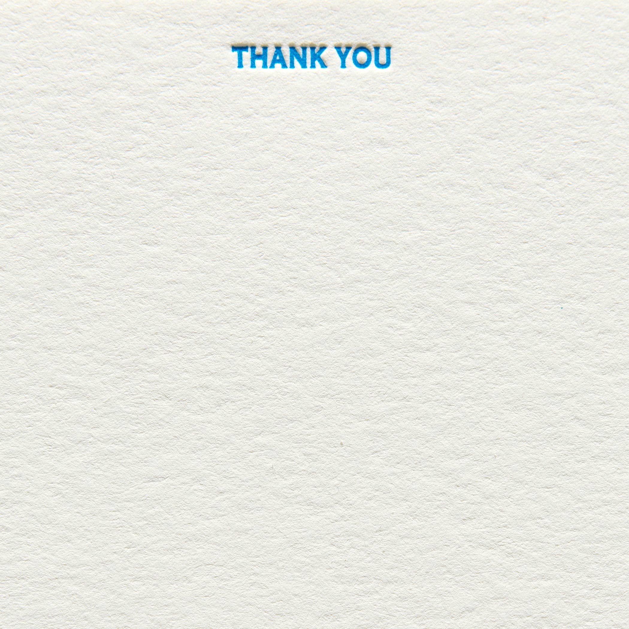 Keep thank you notes at the ready for any occasion. This boxed set includes 10 flat cards and envelopes, letterpress printed by hand on 100% cotton paper. Made with hand-mixed inks for a beautifully crafted touch. Packaged in a clear box.